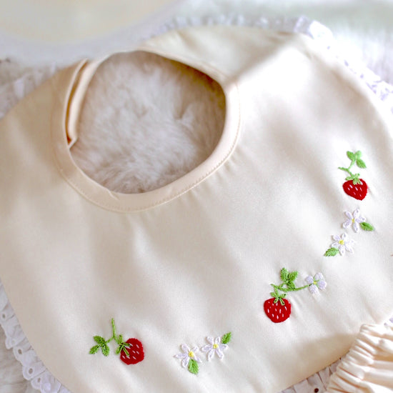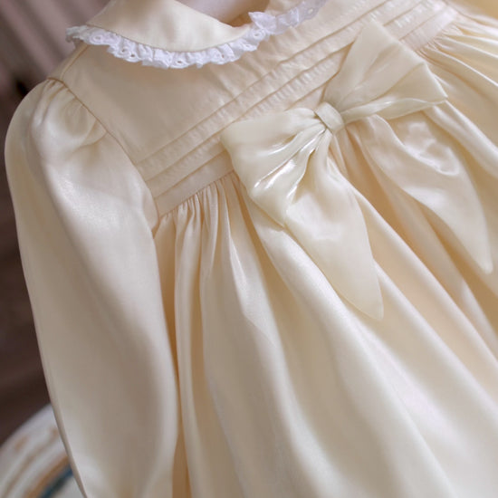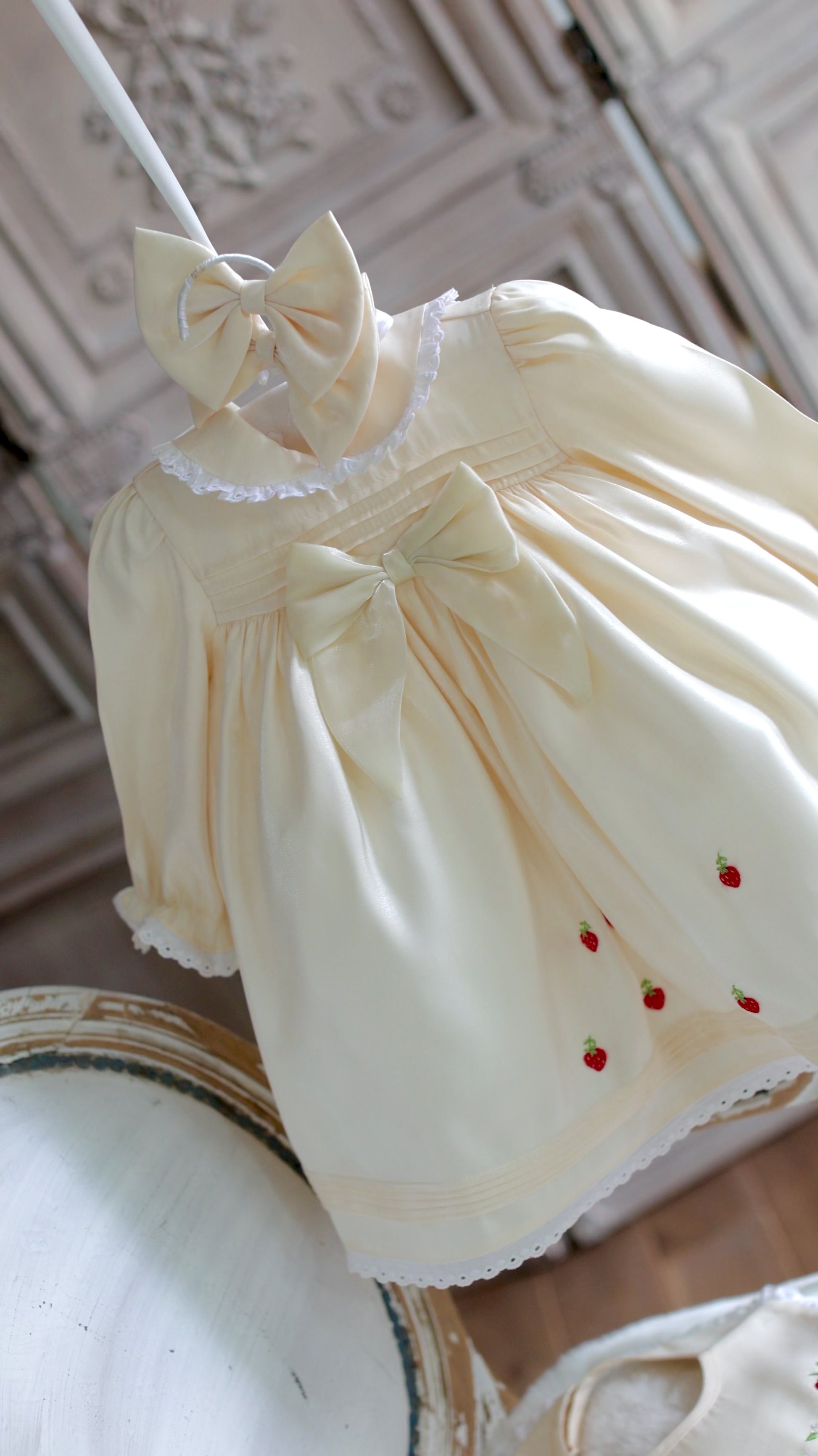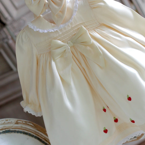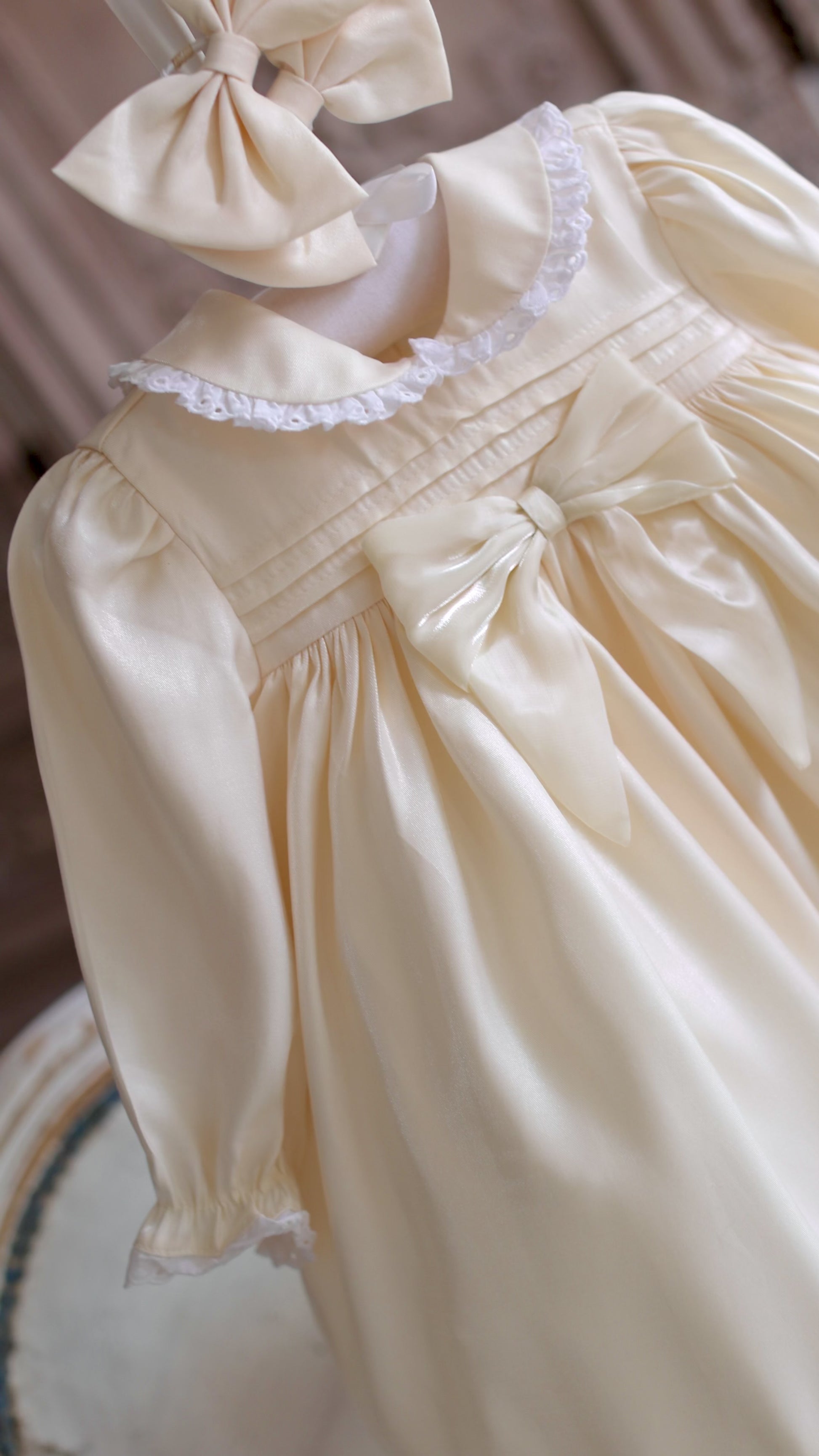 A lovely choice for a special occasion, this shade of biscuit hand-embroidered dress set by Vintage-Voyage offers a timeless look for baby girls. Woven in soft and shimmering taffeta the dress has a cute Peter Pan collar with lace trims and a decorative bow on the front. Lined for comfort, it has neat button fastenings on the back, along with integrated petticoat for the more volume of the skirt. The matching hand-embroidered bib, pair of bloomers and headband complete the look.