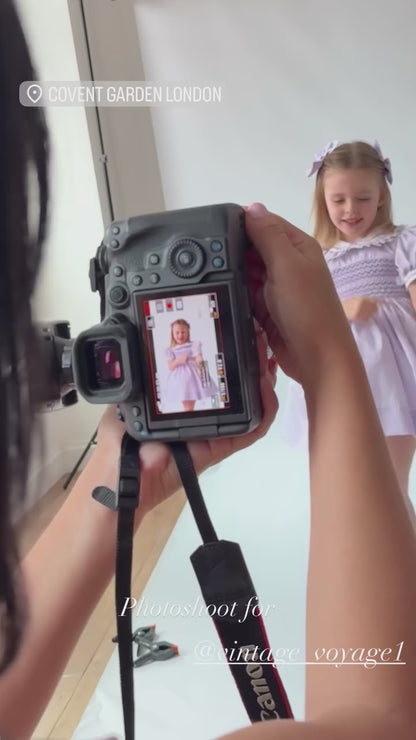 Gorgeous and so special ANNALISE  dress for little girls by British heritage brand Vintage-Voyage. Made in soft cotton blend, it has traditional hand smocking across the bodice, with beautiful hand-embroidery, pretty puffed sleeves and statement Peter Pan collar. The dress has a full, gathered skirt with integrated petticoat and complimentary hair bows (12M-3Y) or headband for the 3M & 6M