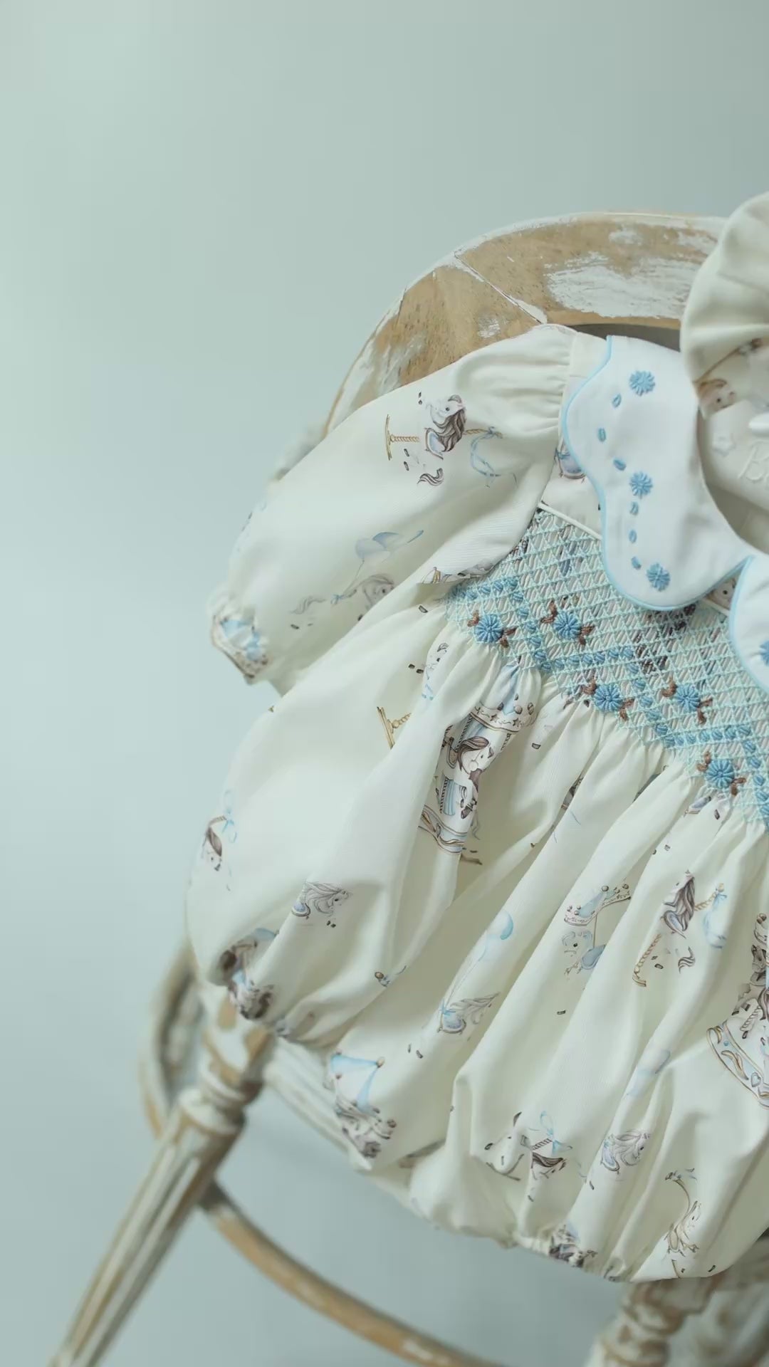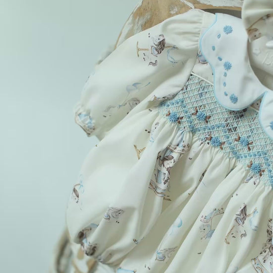 A traditional and stunning baby CAROUSEL shortie set for little girls by Vintage-Voyage, capturing the timeless appeal of classic styling. Made in midweight cotton blend custom printed fabric and fully lined, it features a beautifully hand-smocked panel with delightful embroidery across the bodice. The scalloped hand embroidered collar neatly trimmed with a blue piping. Fastening with buttons on the back and between the legs, it is fully lined and has elasticated cuffs and legs for a comfortable fit. To achieve a more traditional look, the set comes with a matching headband (1M-6M) or two bows for the older girls and charming baby bib.