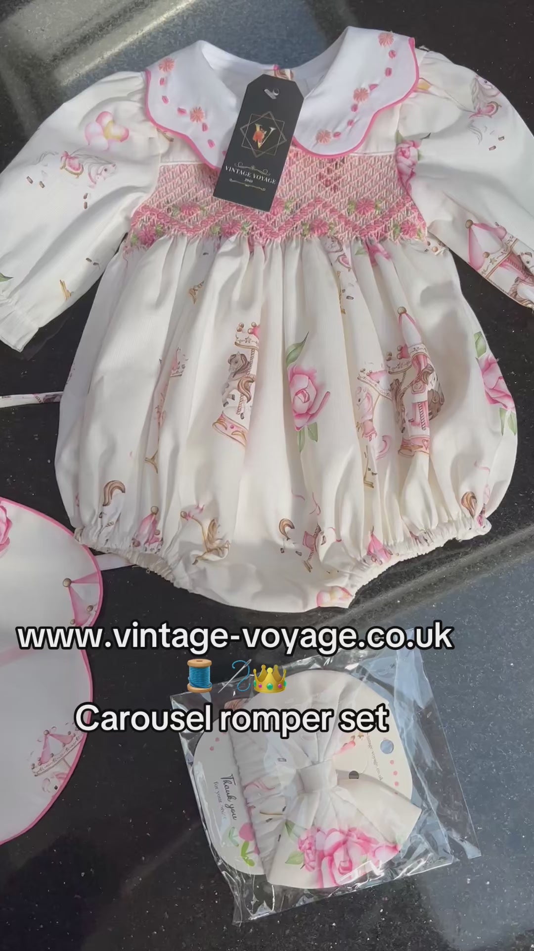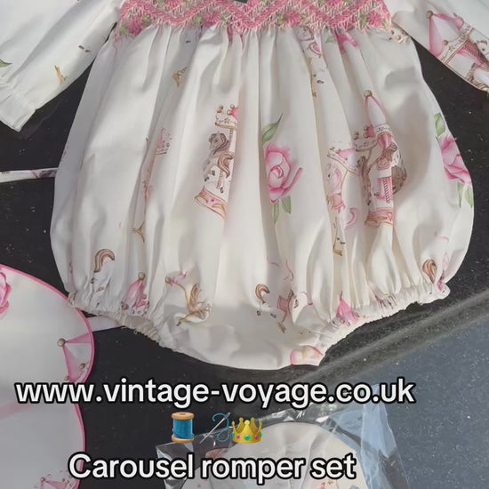 A traditional and stunning baby CAROUSEL shortie set for little girls by Vintage-Voyage, capturing the timeless appeal of classic styling. Made in midweight cotton blend custom printed fabric and fully lined, it features a beautifully hand-smocked panel with delightful embroidery across the bodice. The scalloped hand embroidered collar neatly trimmed with pink piping. Fastening with buttons on the back and between the legs, it is fully lined and has elasticated cuffs and legs for a comfortable fit. To achieve a more traditional look, the set comes with a matching headband (1M-6M) or two bows for the older girls and charming baby bib.