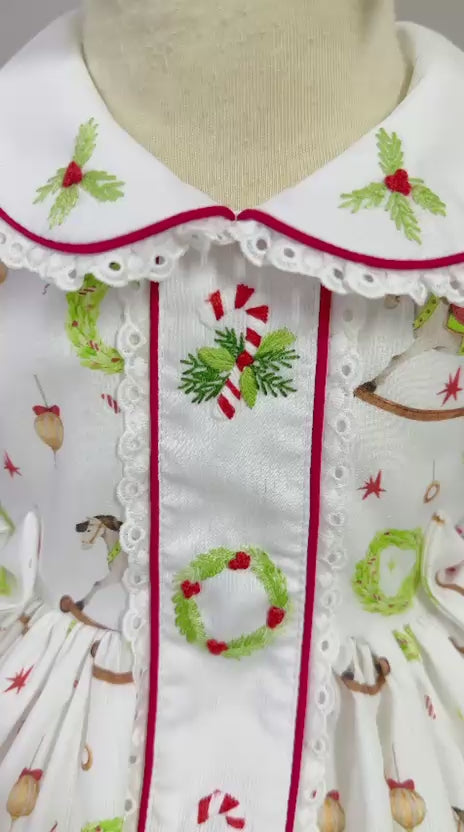 Sweet FESTIVE FUN hand-embroidered dress set for baby girls by Vintage-Voyage. Made in a soft and midweight custom printed cotton blend fabric, the lined dress has a delicate hand-embroidery on the bodice, pretty baby buttons and puffed sleeves. A pair of matching knickers, embroidered bib and a pretty bows or headband (0-3m-6-9m) complete the traditional look.
