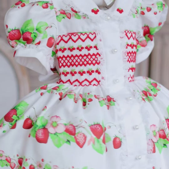 Sweet as a strawberry our JUICY hand-smocked dress for baby girls by Vintage-Voyage. Made in a soft and midweight custom printed cotton blend fabric, the lined dress has a delicate hand-embroidery on the bodice, pretty pearl buttons  and puffed sleeves. A pair of matching knickers,  and a pretty bows or headband (0-3m-6-9m) complete the traditional look.