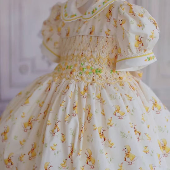 Cute As Can Be our LUCKY hand-smocked dress for baby/toddlers girls by Vintage-Voyage. Made in a soft and midweight custom printed cotton fabric, the lined dress has a gorgeous hand-embroidery on the bodice, pretty hand-embroidered collar and puffed sleeves. A pair of matching bows (12m-4y) or a pretty headband (3m-6m) complete the traditional look.