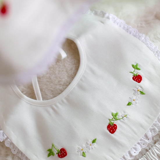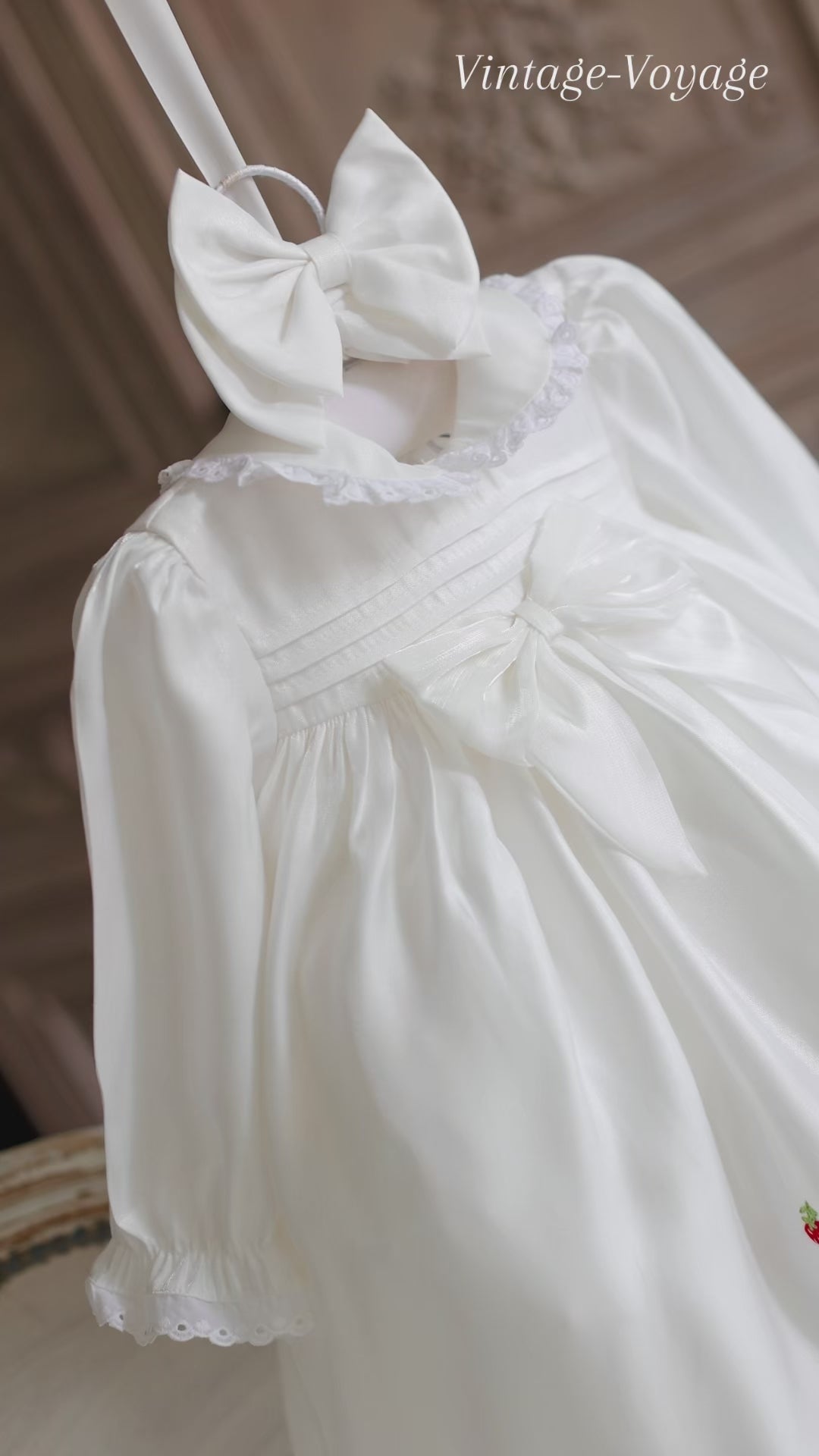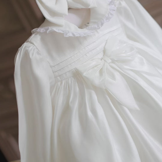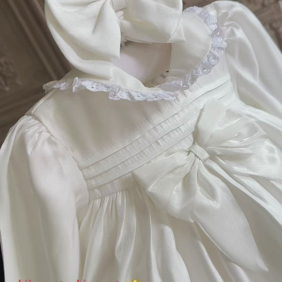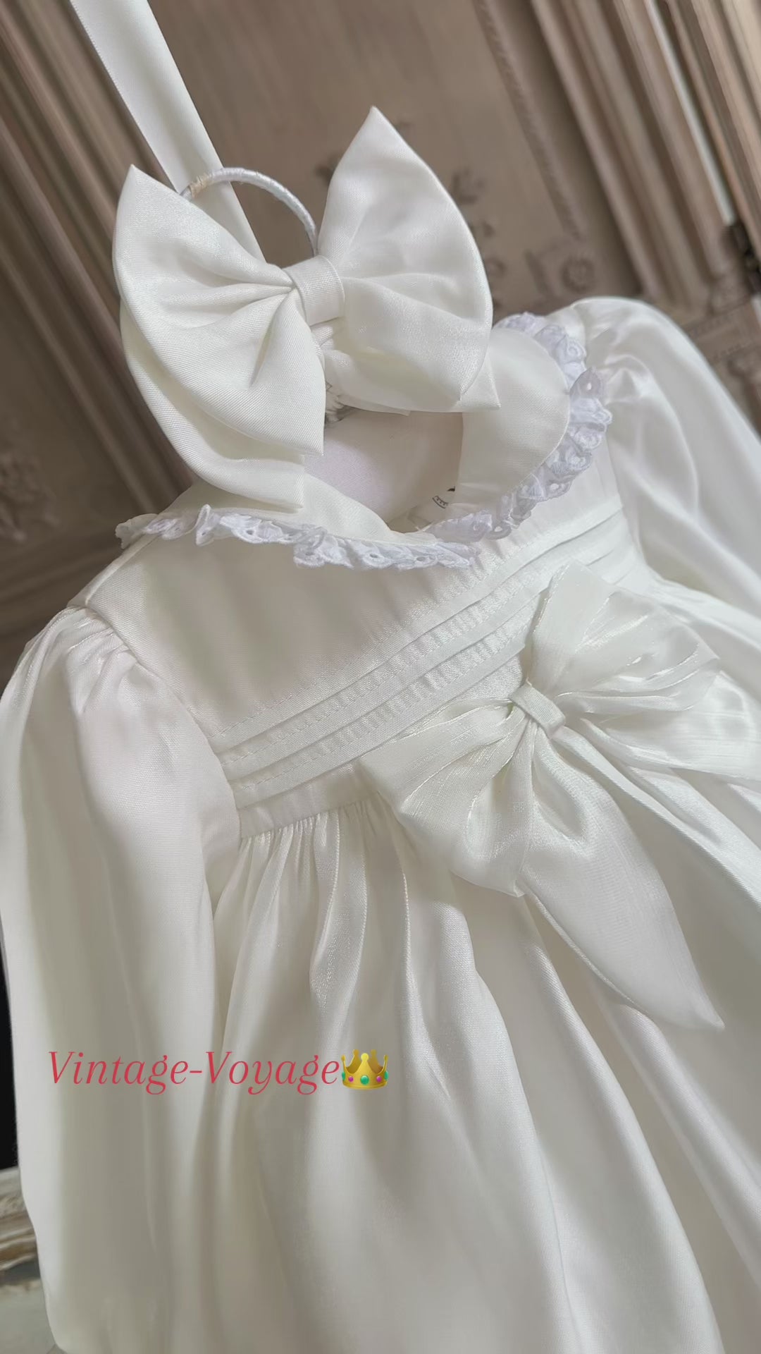 A lovely choice for a special occasion, this white hand-embroidered dress set by Vintage-Voyage offers a timeless look for baby girls. Woven in soft and shimmering taffeta the dress has a cute Peter Pan collar with lace trims and a decorative bow on the front. Lined for comfort, it has neat button fastenings on the back, along with integrated petticoat for the more volume of the skirt. The matching hand-embroidered bib, pair of bloomers and headband complete the look.