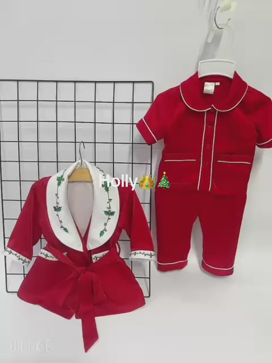 Boys red pyjama set by Vintage Voyage, made in luxury soft silk/satin. This set includes a matching dressing gown with a tie belt with an embroidered holly plant. The pyjama top has two front pockets, button fastenings and the trousers have an elasticated waistband.